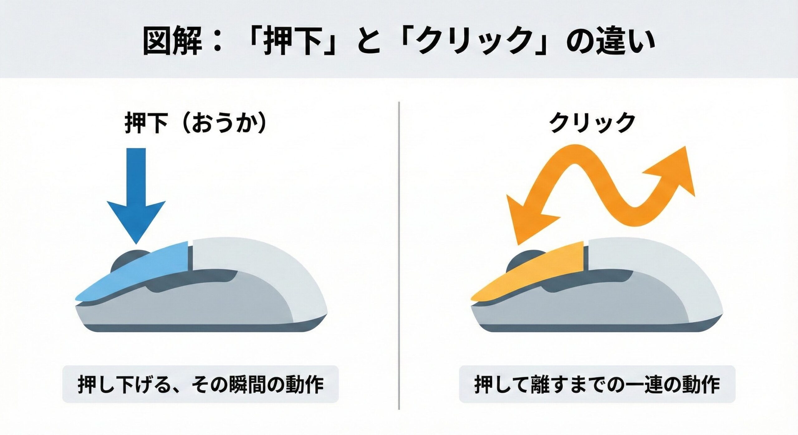 簡単に言うと、「クリック」はマウスのボタンを「押して、すぐに離す」までの一連の動作全体を指す言葉です。一方で「押下」は、キーボードのキーやマウスのボタンを「グッと押し下げる」という、その瞬間の動作だけを指します。