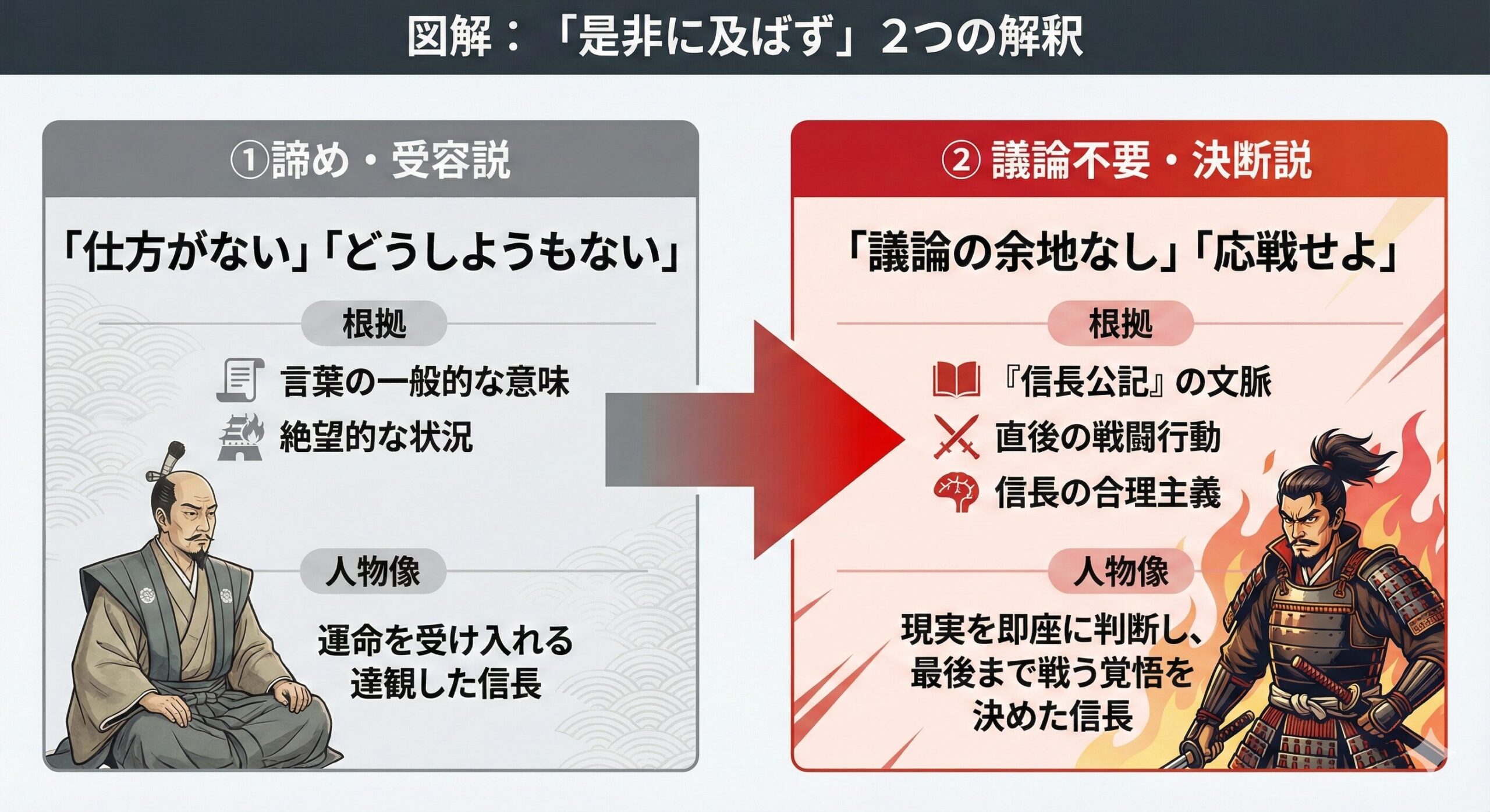 • 出発点の確認: 信長の言葉は「是非もなし」ではなく、一次史料『信長公記』によれば「是非に及ばず」です。