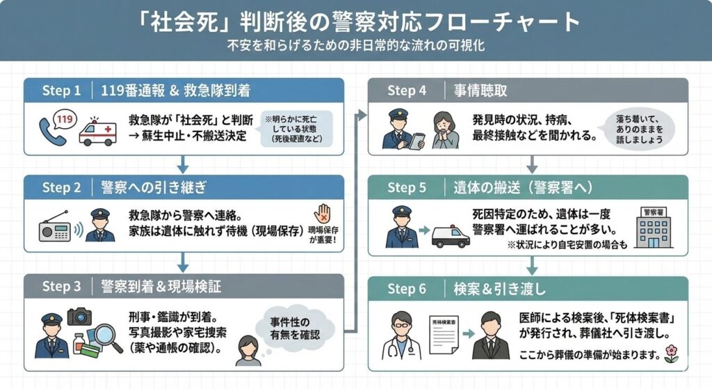 ここからは、実際に家族が自宅などで倒れており、救急隊に「社会死」と判断された後の流れを時系列で解説します。病院で亡くなる場合とは全く異なるプロセスになります。