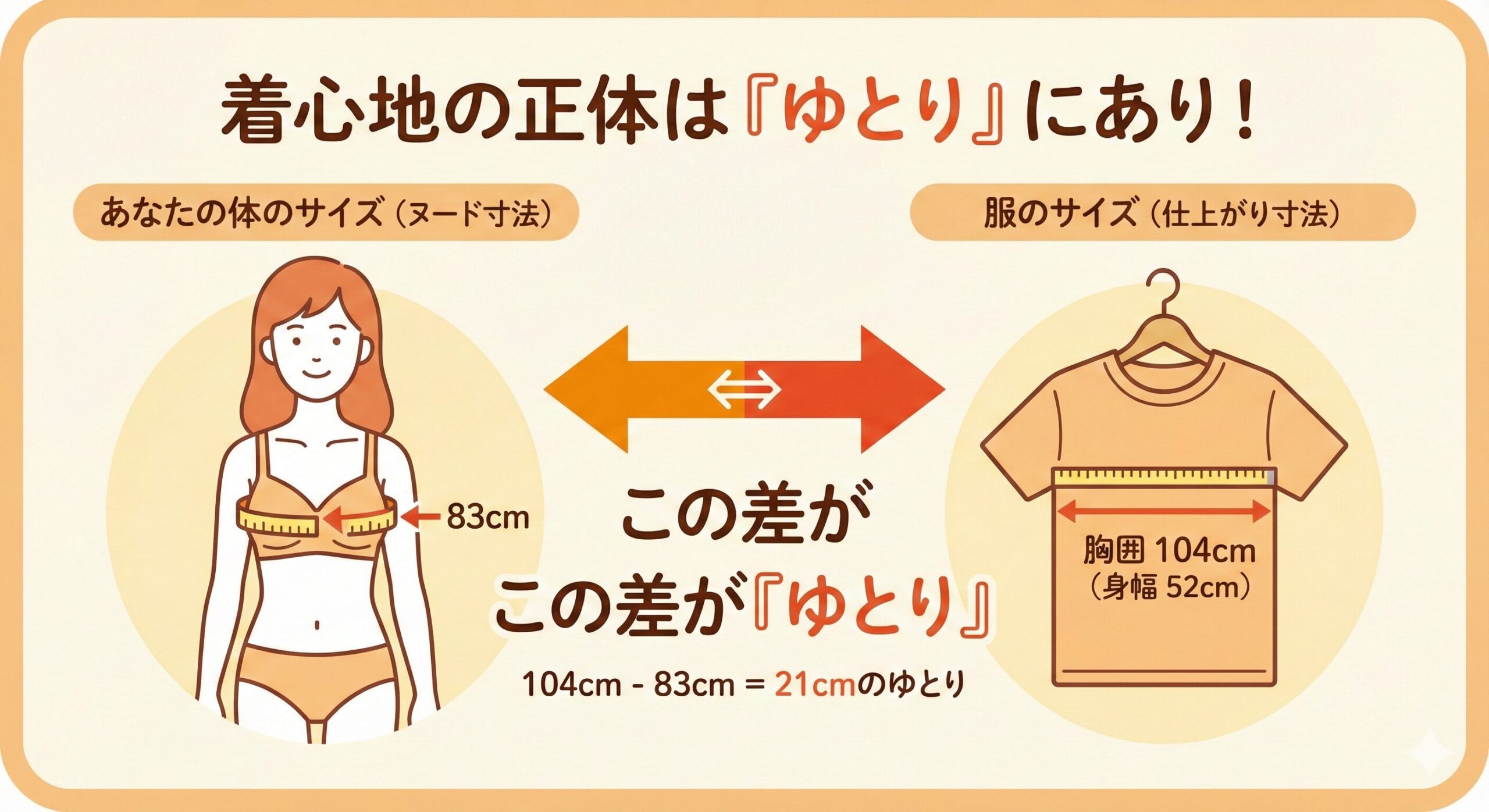 そして、このヌード寸法仕上がり寸法の関係性こそが、着心地の良し悪しを決める「結果」を生み出します。具体的には、この2つの寸法の差が「ゆとり」になるのです。この「ゆとり」こそが、モデルさんが着ているような「いい感じのフィット感」の正体です。