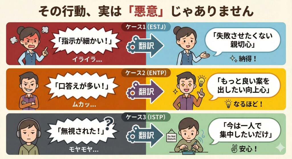 - ケース1 (ESTJ): 怒っている顔のイラスト。「指示が細かい!」→ 翻訳 → 「失敗させたくない親切心」