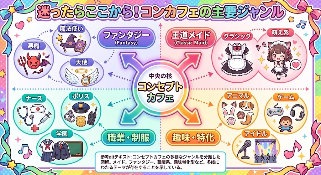 よく混同される「メイドカフェ」は、コンセプトカフェという大きなカテゴリーの中の一種です。かつてはメイド服を着た接客が主流でしたが、現在のコンカフェは、魔法使い、アイドル、ナース、学園、さらには特定の動物やアニメの世界観など、多種多様な広がりを見せています。