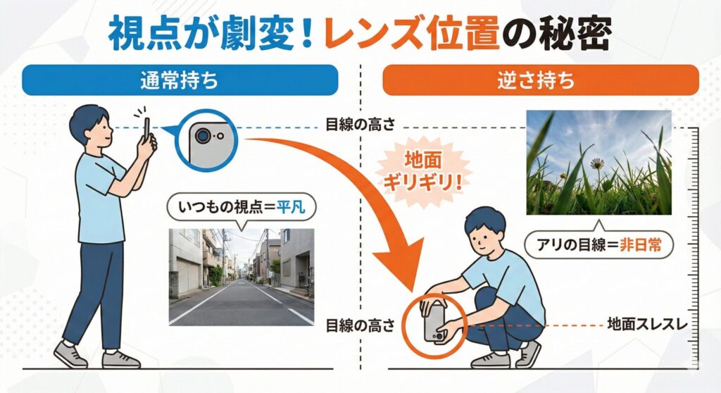 ほとんどのスマホは、本体の上部にカメラレンズがついていますよね。普通に構えると、レンズの位置は地面から150cmくらいの高さ(大人の目線の高さ)になります。これは私たちが普段見ている景色と同じ、「当たり前の視点」です。