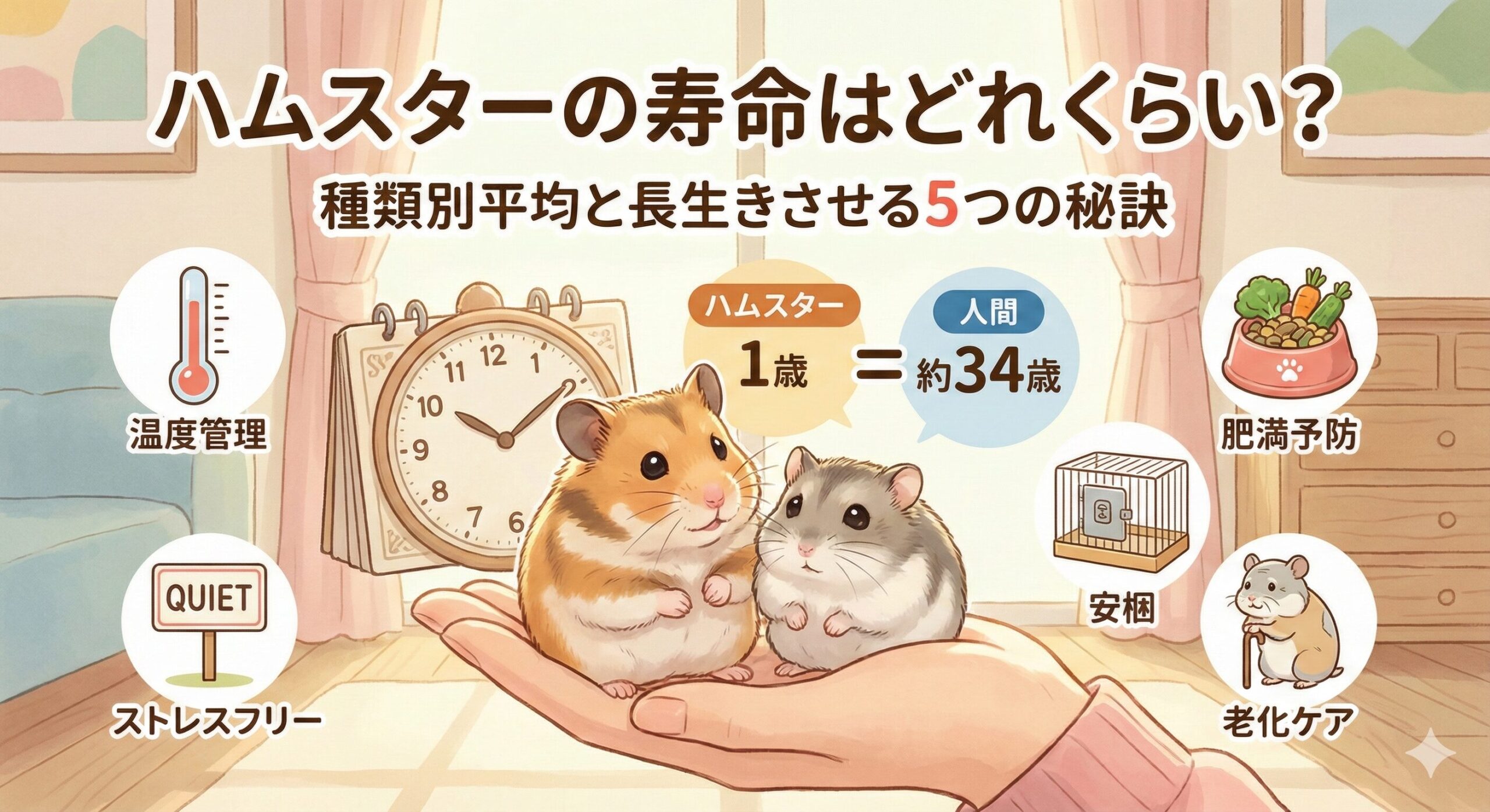 この記事では、ハムスターの種類ごとの平均寿命や、人間の年齢への換算表、そして1日でも長く一緒に過ごすための「長生きの秘訣」を解説します。