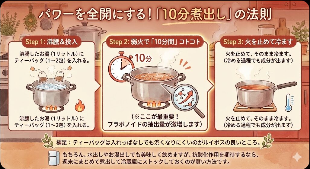 もちろん、水出しやお湯出しでも美味しく飲めますが、抗酸化作用を期待するなら、週末にまとめて煮出して冷蔵庫にストックしておくのが賢い方法です。