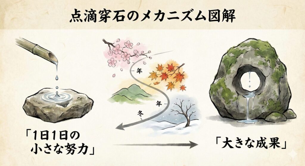 小さな水滴でも、長い間落ち続ければ硬い石に穴を開けることができる。転じて、わずかな力でも積み重ねれば大きな事業を成し遂げられるという意味。