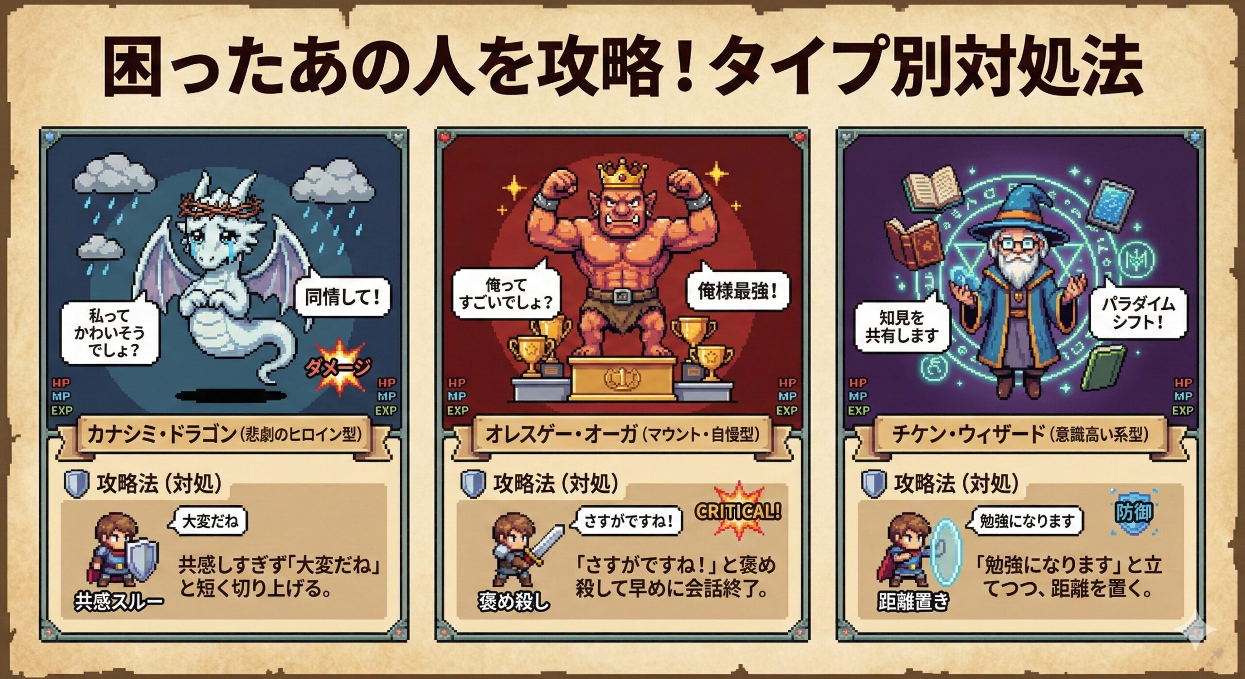 - 他人の自己顕示欲には: 「寂しいんだな」と背景を理解し、適度な距離でスルーする。