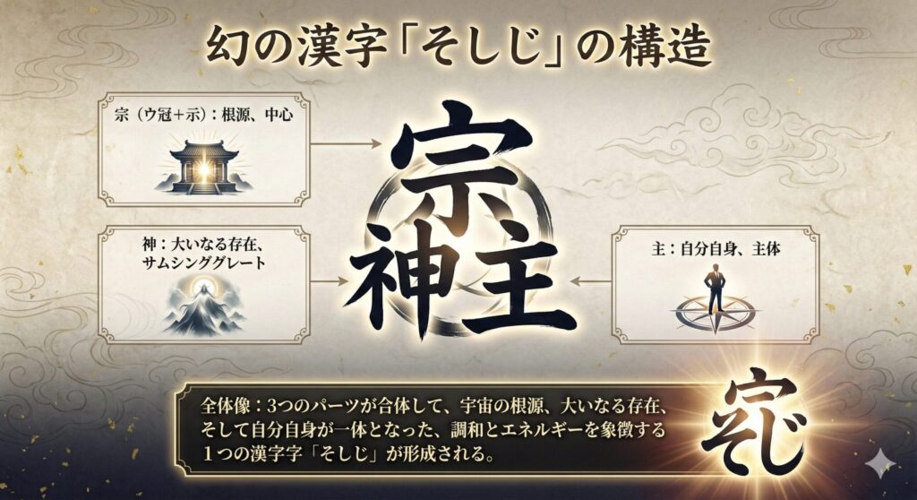 「宗(根源)」「主(自分)」「神(大いなる力)」が一体となることで、人間としての最高の精神状態を表しているとされています。
