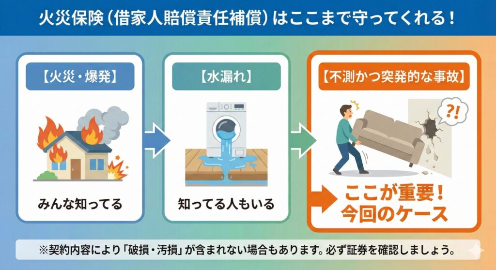 実は、多くの賃貸用火災保険には「借家人賠償責任補償(しゃくやにんばいしょうせきにんほしょう)」という特約が付いています。そしてこの補償は、火災だけでなく、「不測かつ突発的な事故」による破損もカバーしてくれるケースが非常に多いのです。