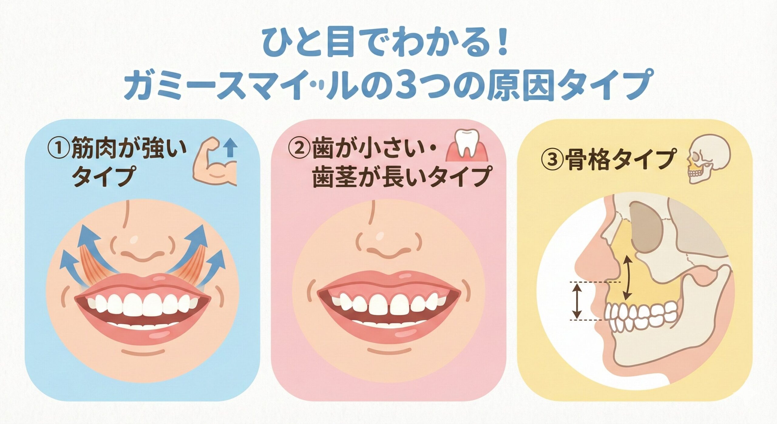 「なぜ私だけ歯茎が見えるんだろう?」と不思議に思いますよね。ガミースマイルの原因は一つではなく、主に3つのタイプに分けられます。原因を正しく理解することが、ご自身に合った解決策を見つけるための最も大切なステップになります。