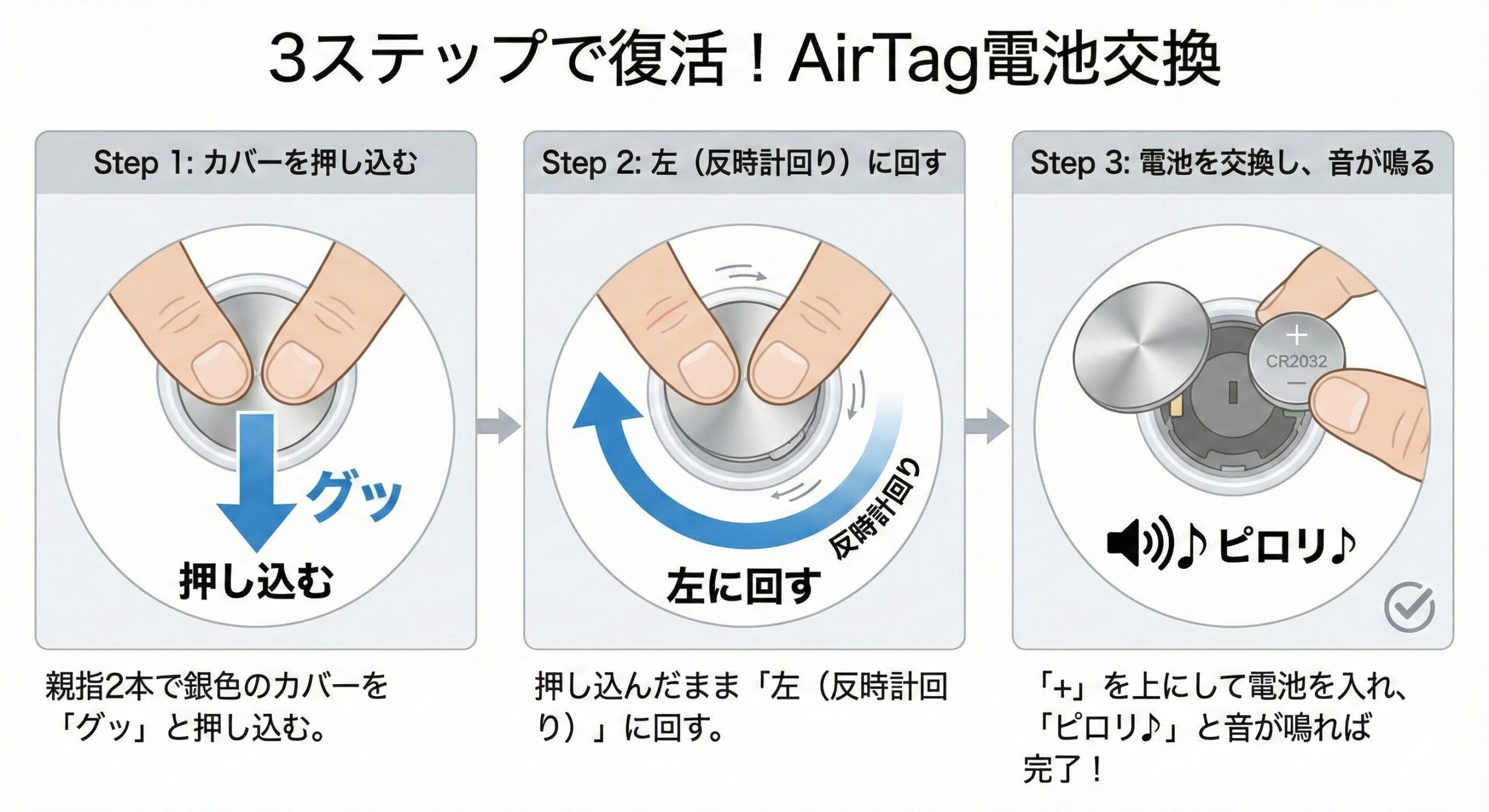 - 成功サイン: 電池を正しく入れると、AirTagから「ピロリ♪」という起動音が鳴ります。