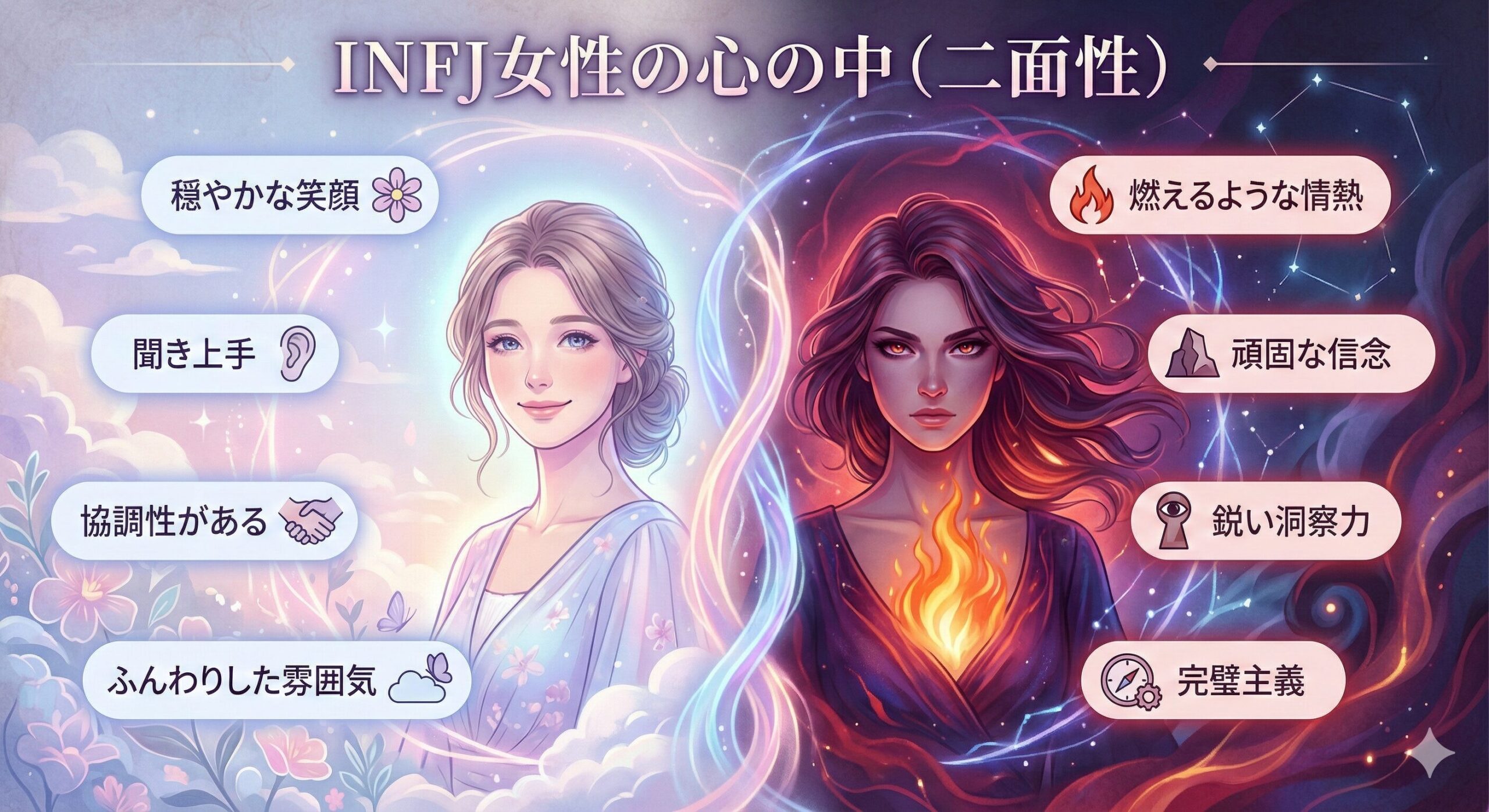 全人口のわずか1%未満とも言われるINFJ。中でも女性は、その繊細な感受性と強い芯の強さが同居する、非常に稀有で魅力的な存在です。しかし、その独自性ゆえに「理解されない孤独」や「生きづらさ」を抱えやすいのも事実です。